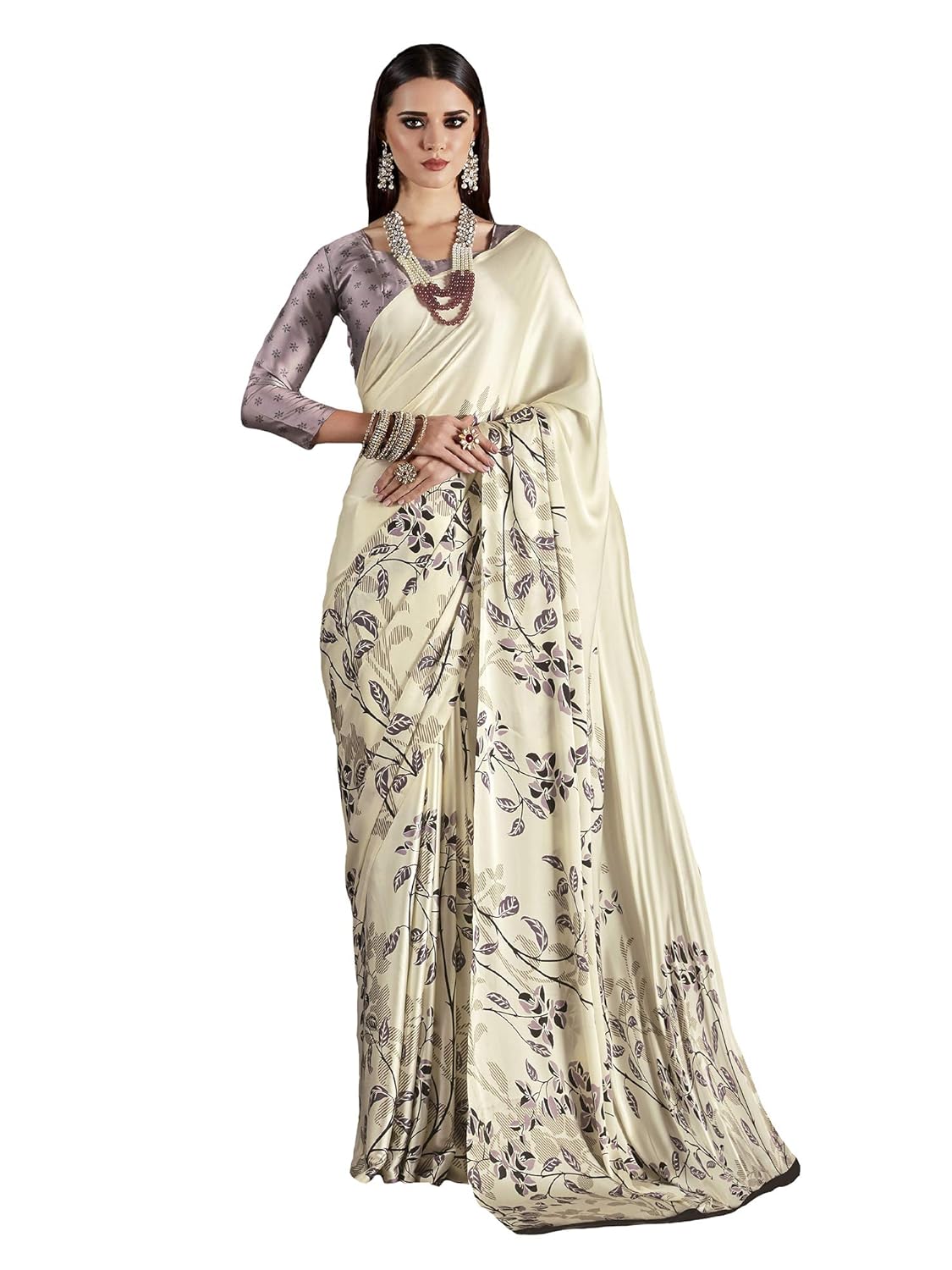 AKHILAM Women's Floral Printed Crepe Saree with Unstitched Blouse Piece (Cream and Purple_KONKN70009)