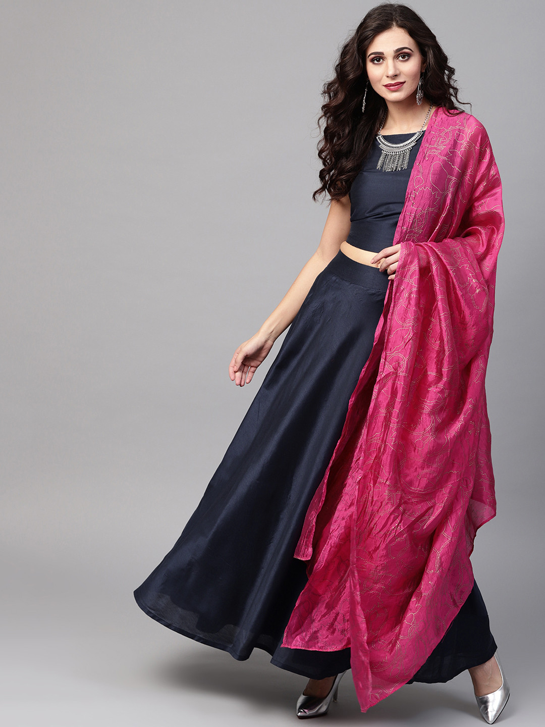 Navy Blue ready to wear lehenga, has a flared hem, zip closure