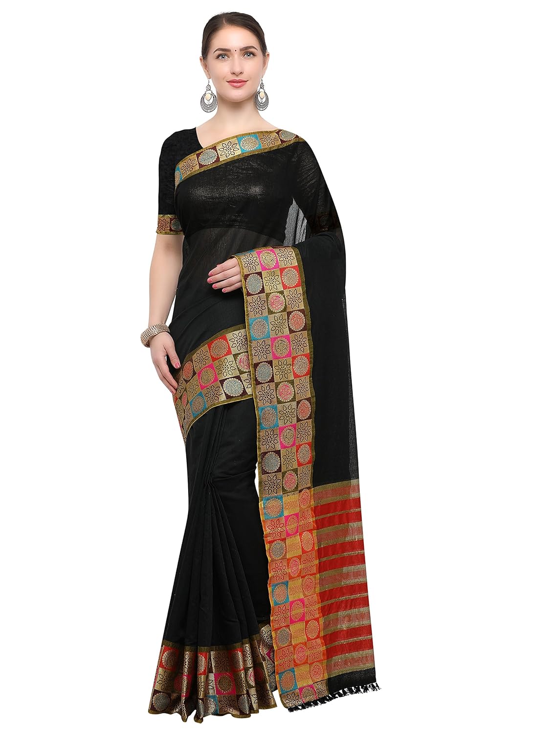 Saree Fabric : Silk Cotton, Saree Colour : Black & Saree Length : 6.3 mtr(Including Blouse) Blouse Fabric : Silk Cotton, Blouse Colour : Black, Blouse Length : 0.8 mtr,Type : Running Unstitched Blouse(Included In Saree Length 5.5 mtr + 0.8 mtr) Work Type : Zari Woven Work ,Saree Border : Broad Zari woven design border , Saree Pallu : Woven Zari Stripes work on pallu , Finish Type : Soft/Comfort to wear & Saree Type : kanjivaram silk sarees new collection For more amazing products please visit https://www.handpickedproductsforyou.com/