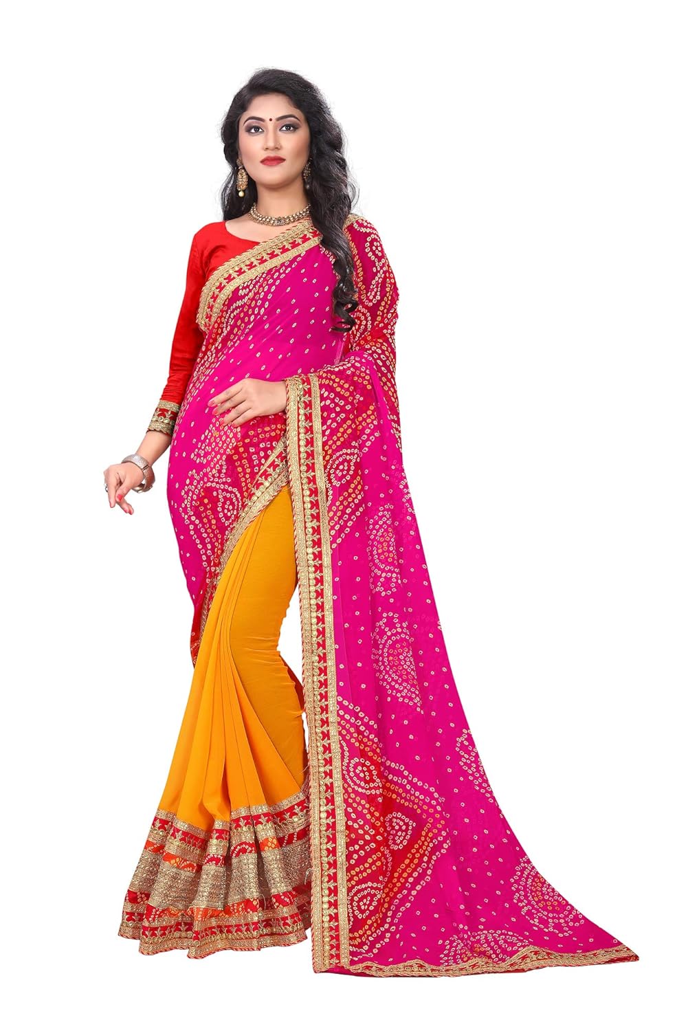 Color:Pink And Yellow,Fabrics: Georgette Saree Length: 5.50 meters ; Blouse length: 0.80 meters. Package Contents-1 Saree and 1 Blouse Style : Bandhani Saree Wash Intstruction:-Wash Separately in Cold Water; Do not bleach; Dry in ShadeFor more amazing products please visit https://www.handpickedproductsforyou.com/