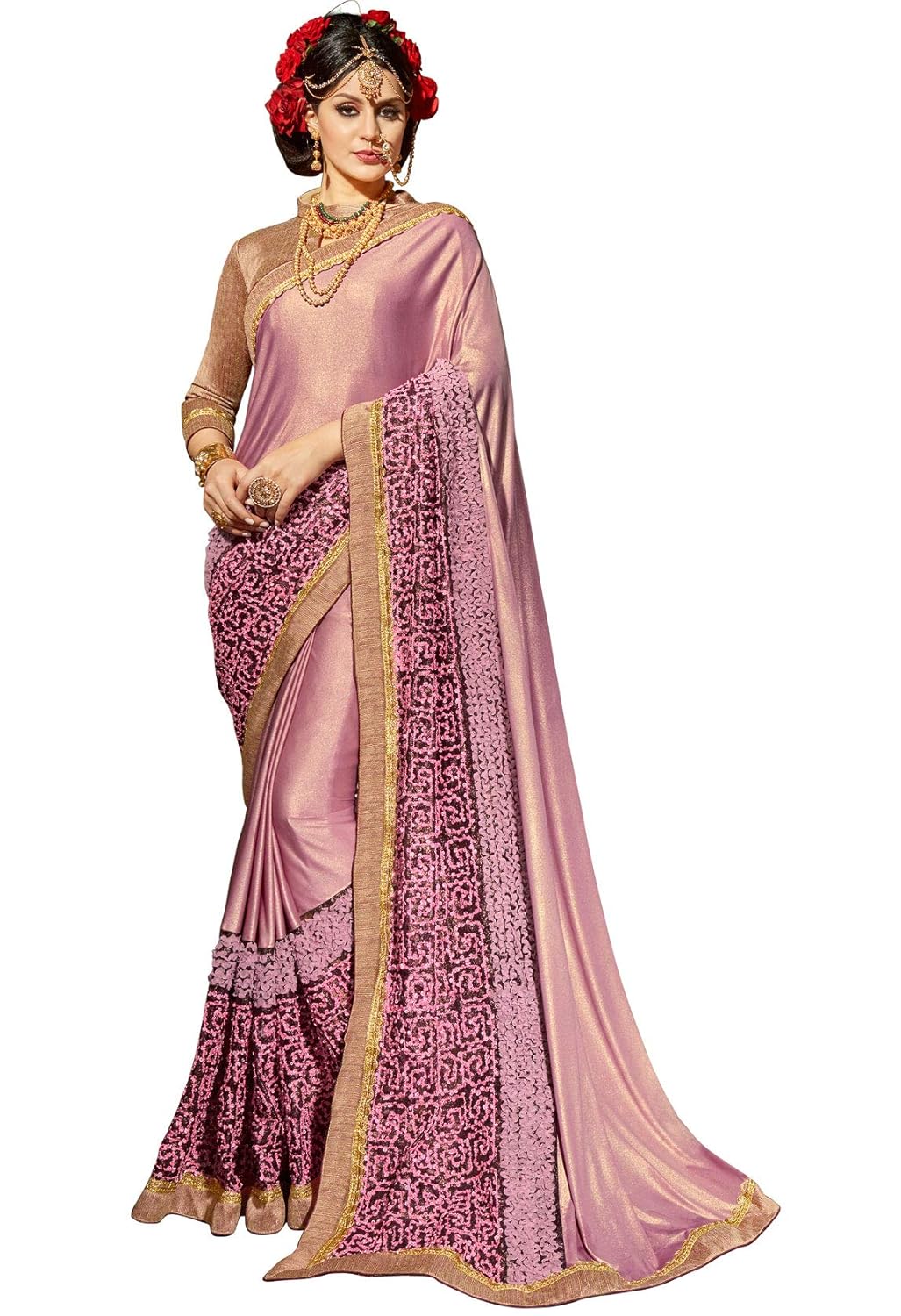 Shangrila Designer Shimmer Net Embroidery Satin Silk Saree with Brocade Lace Unstitched Blouse Piece (Purple, MARVEL2-8331)
