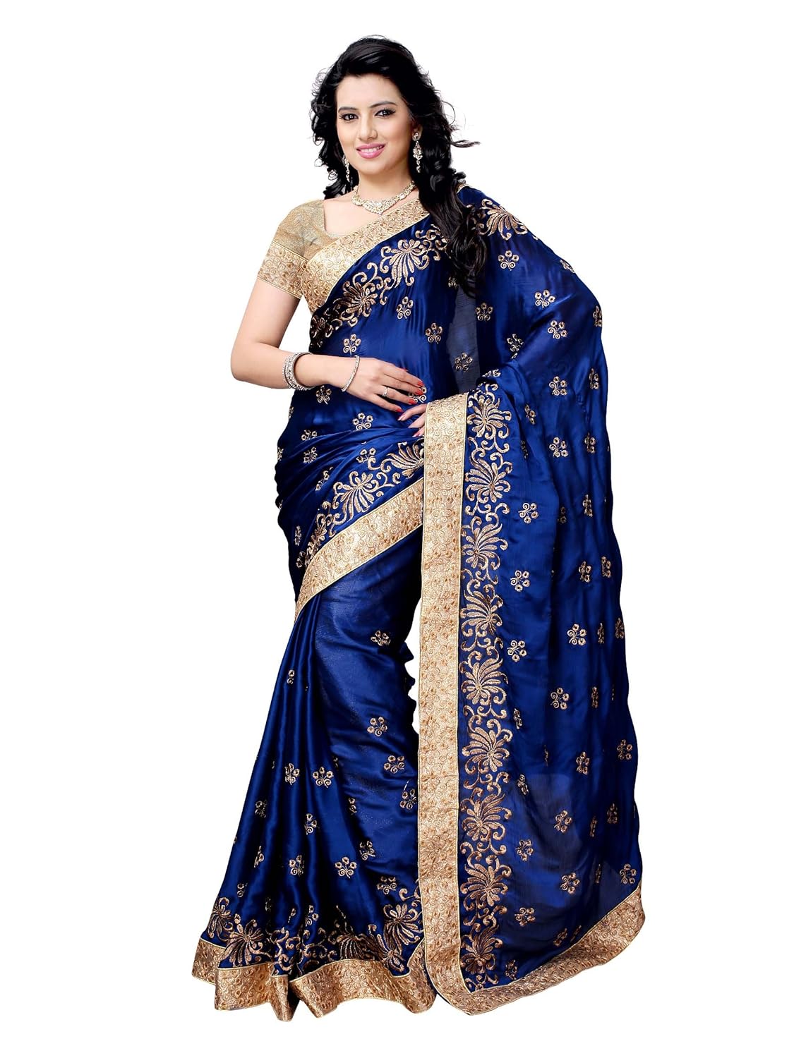Womanista Women's Embroidered Satin Saree with Blouse Piece (FS5027-Blue-Free Size)